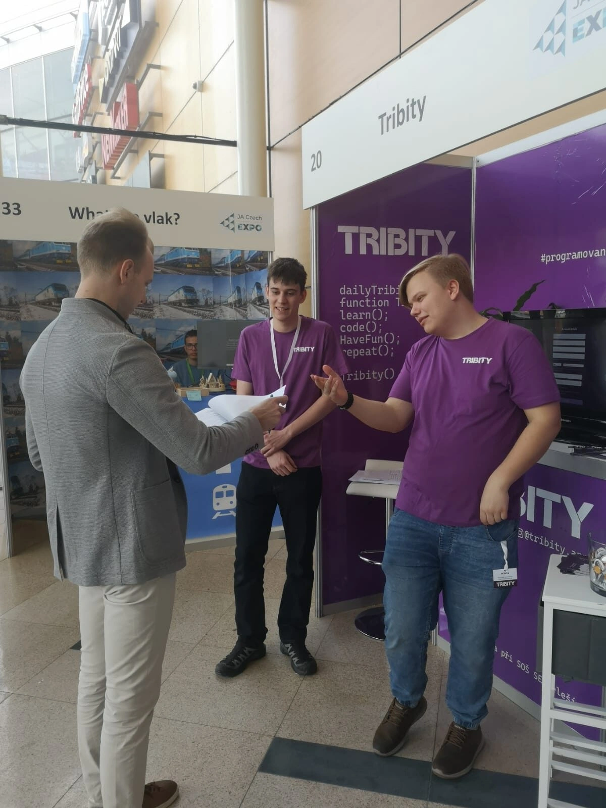 Ve středu 9. 4. 2025 se poprvé účastnily dvě naše studentské firmy veletrhu JA Expo v Praze v Galerii Harfa, který organizuje společnost JA Czech, která svým výukovým programem aktivně podporuje zájem studentů na SŠ o podnikání. Veletrhu se účastnil výběr 40 studentských firem z celé České republiky. Svoje podnikání zde představili pod záštitou JA Czech své podnikání firmy žáků z IT3A – Halftale Arts – a žáků z IT3B – Tribity.