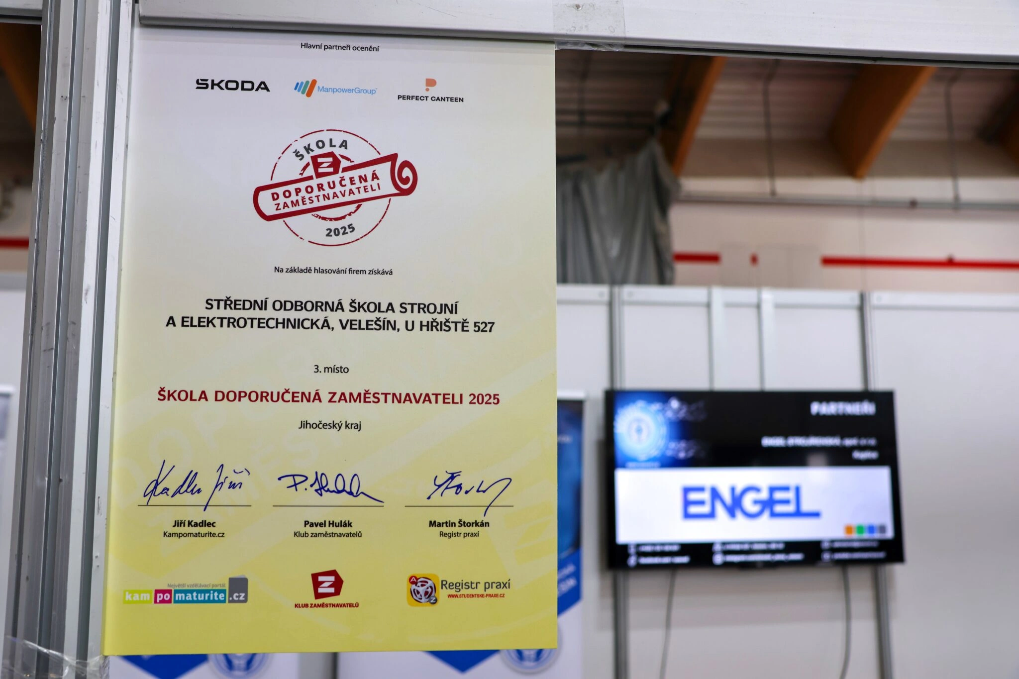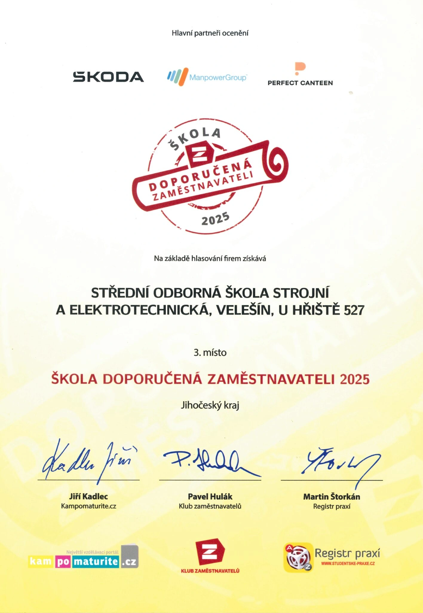 Z letošního ročníku si odvážíme i moc hezké ocenění – třetí místo v Jihočeském kraji v soutěži Škola doporučená zaměstnavateli 2025.